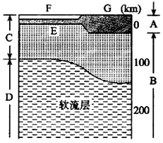 本题解析:图中A为地壳,B为地幔,地壳和地幔之间的界面E为莫霍界面,地壳和上地幔顶部(软流层以上的部分)合起来,即C为岩石圈A正确,B、C错误;陆地地壳比海洋地壳厚,F为海洋,D错误。