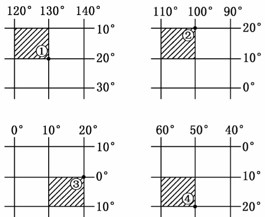 小题2:在四幅图中斜线所表示的经纬线方格内,面积最大的是(? )