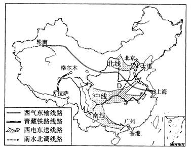 (3)四大工程建设有利于我国东西互补、南北共济、资源共享,请写出我国水资源、能源和经济发展水平的地区差异。(6分)