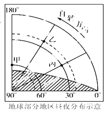 ⑴此时晨昏圈的位置是____________________,其中____________是晨线,____________是昏线。(6分)