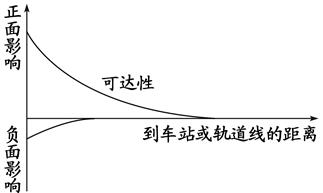 1、单选题 许多特大城市都很注重地面轨道交通和地下轨道交通(地铁)的建设,下图为“地面轨道交通对房地产的影响”,读图回答城市地面轨道交通对沿线房地产的正负影响分别是 ( )