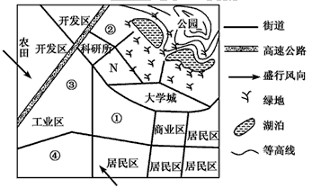 5、单选题 下图为“多核心模式某城市空间结构示意图”,该城市空间结构尚合理。读图回答: