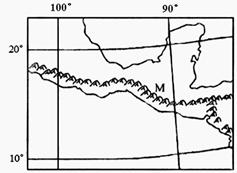 小题3:图中夹在90°与100°经线之间的一段山脉的长度约为