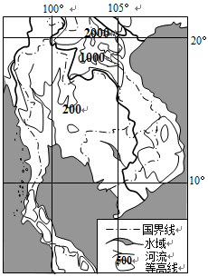 小题1:泰国是东南亚的国家,气候属于热带季风气候,受冬季风、夏季风交替控制,一年有明显的旱雨两季,年降水量大,且集中在夏季。①对。热带雨林气候区常年受赤道低压带控制,②错。从图中等高线看,泰国中南部地区海拔在200米以下,属于平原区,地势低平,易发生涝灾,③对。北部根据等高线判断,海拔在200-1000米之间,地势较高,不易积水,④错。所以选项A对。B、C、D错。