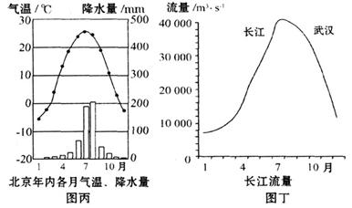 (3)通过图丙和图丁可看出:长江水量丰枯与北京地区的降水多少存在一致性,因些要想南水北调,必须先蓄水,否则枯水期,南北方都缺水,无法调水。