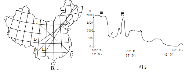 2、单选题 下图2为沿图1(相邻经线或纬线的间隔均为5°)某剖面线的地形剖面示意图。完成问题。
