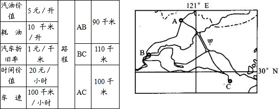 2.BC段耗油110千米/10千米/升×5元/升=55元,汽车折旧率1元/千米×110千米=110元,时间价值110千米/100千米/小时×20元/小时=22元;AB段耗油90千米/10千米/升×5元/升=45元,汽车折旧率1元/千米×90千米=90元,时间价值90千米/100千米/小时×20元/小时=18元共计340元。
