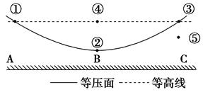 本题解析:本题考查等压面。等压面上气压相等,等压面以下,气压较高;故A、C处的气压明显较B处高,故判断温度最高的为B点,由于温度高,故气流上升,近地面形成低压。