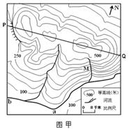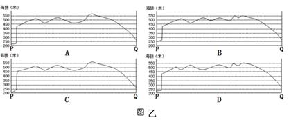 (3)图乙四幅地形剖面图中,能正确反映图甲中PQ一线地势起伏状况的是?(选择填空)。(2分)