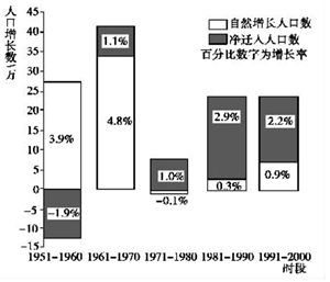 小题1:据图可知,该国50~60年代人口的增长主要是自然增长;70年代人口自然增长率为负值,这一阶段人口的死亡率高于出生率;从1951~2000年来看,该国净迁入人口较多,因此是人口的净迁入国。人口增长了多少百分点无法计算。故选A项。