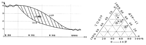 (2)右图中①②③④四个国家中,老龄化问题最严重的是______,左图中哪个阶段可能会出现该问题____________,其人口增长模式的基本特征是________________________。