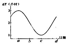 3、单选题 若不考虑地形和天气,甲地(Oº,0º)比乙地总是先看到日出,△T表示某日甲地与乙地日出的时间差,下图示意△T的年变化曲线。读图完成下列各题。