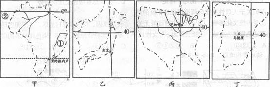 小题3:乙位于欧洲西部,属于温带海洋性气候,利于粮食作物生长;丙位于亚洲的东部,位于太平洋的西北部,沿岸日本暖流与千岛寒流交汇,形成著名的北海道渔场。