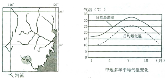(1)从纬度位置看,甲区域位于我国东南沿海地区,茶树生长所需温度在15-30度之间,观察甲地多年平均气温,最高低于35℃,最低高于10℃,适合茶树生长。