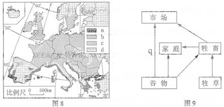 3、单选题 图8为欧洲四种农业地域类型分布图,图9是该区域某种农业地域类型的经营方式示意图。读图回答14~16题。