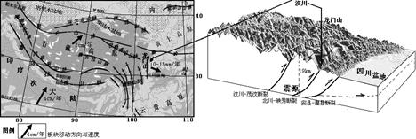 5、综合题  北京时间2008年5月12日14时28分,四川省发生里氏8.0级地震,震中位于汶川县映秀镇。地震造成重大人员、财产损失。读图,回答下列问题。(10分)