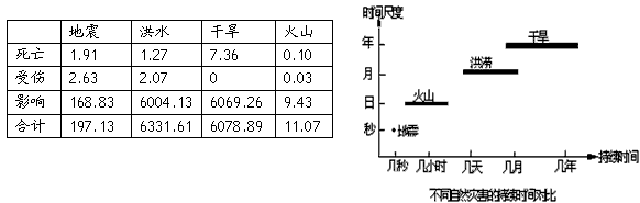小题1:图中④持续时间最长应该是旱灾(长时间无降水或降水偏少),①的时间很短,是地震爆发的特点。故选B。