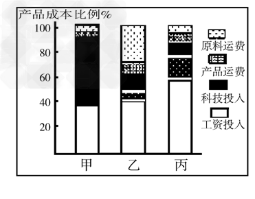 本题考查影响工业区位选择的主导因素。根据影响工业区位选择的主导因素不同,原料重量大于产品重量,或原料不便于长距离运输的为原料指向型工业;产品重量大于原料重量,或产品不便于长距离运输为市场指向型工业;工业生产需要消耗大量能源的为动力指向型工业;生产对劳动力数量要求较多的是廉价劳动力指向型;技术投入较多的是技术指向型。图中甲的科技投入较高,属于技术导向型工业。所以本题选择B选项。