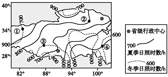 【小题1】根据等值线的一般规律,读出①--④点的冬、夏季日照时数,然后做差找出差值最大地点。由图可知①夏季日照时数在900—1000小时之间,冬季日照时数为700小时,所以冬夏差值为200--300小时;同理可知②、③冬夏差值均为100—200小时之间;④冬夏差值为100小时,故选项A符合题意。