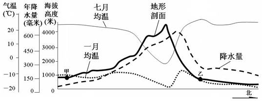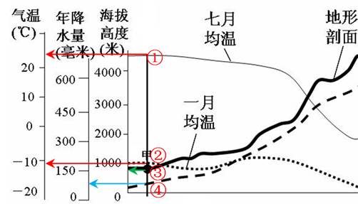 小题1:此图所用的坐标较多,总共有三个:气温、年降水量、海拔高度。经过甲点作一垂线,该垂线分别与七月均温线、一月均温线、年降水量线、地形剖面线存在一交点(如下图①~④)。