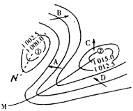 1、综合题 读下面北半球某地等压线分布图,完成下列要求。