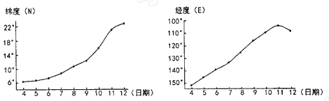 1、单选题 读2013年10月4-12日,某天气系统中心位置移动经纬度示意图。完成下列各题。