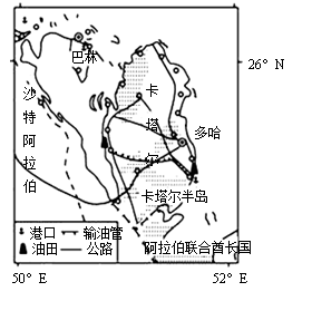 1、单选题 卡塔尔是西亚的一个阿拉伯国家,位于波斯湾西南岸的卡塔尔半岛上,属热带沙漠气候。卡塔尔拥有丰富的石油和天然气,读卡塔尔位置图回答问题。