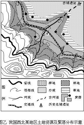 材料二?我国西北某地区土地资源及聚落分布示意(图乙)