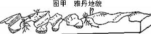 材料一?外力作用沿裂隙处进行侵蚀,使之日益增大,使原来平坦的地面形成许多不规则的浅槽和槽间垄脊,这种地貌称为雅丹地貌(图甲)。