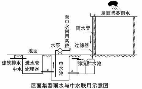 4、单选题 有专家发明了屋面集蓄雨水系统与中水联用的工程设计(中水指工程用水、生活用水等污水处理后的再生水)。读图回答题