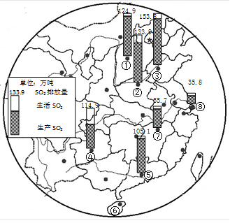 1、单选题 2010年我国部分省区(图中数码所示)二氧化硫排放量统计图(图),回答下列各题。