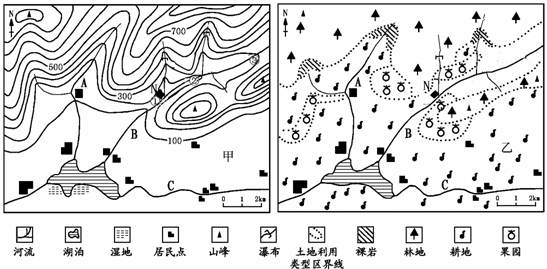 3、综合题 图甲是某时期我国南方某流域局部地形图,图乙是10年后该地区土地利用状况图,读图完成下列问题。(26分)