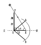 B题.下图是我国某校地理研究性学习小组为了探究正午杆影特点(朝向与长度)而设计的理论分析图,OE、OA、OB为一天中不同时刻旗杆的影子。读图回答下列问题。(10分)