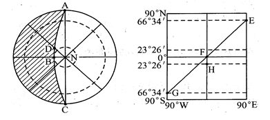 (1)根据图示:北极圈及其以北地区出现极昼现象,所以太阳直射点的纬度为23°26′N。根据EFG为晨昏线,北极圈及其以北地区出现极昼现象,所以90°W的地方时为12:00,为直射点所在的经度。