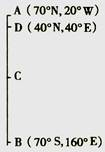 点评:本题的关键是弄清楚赤道上C点的日落时间为当地的地方时18:00,同时能计算出D(40N? 40E)的日落时间为当地地方时的20:00