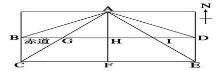小题2:G点刚好日出,所以G所在的晨昏线为晨线,GI为白天。同时G,H,I都位于赤道上,赤道上6点日出,18点日落,H为正午12点,A和H处在同一条经线上,所以地方时相同。