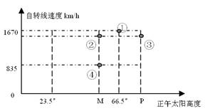 小题1:①地自转线速度为1670km/h,说明在赤道上;②和③自转线速度相等,该日正午太阳高度不同,说明两地纬度相同但不在同一半球;④地自转线速度最小835km/h,说明该地纬度为60°,纬度最高。选项B正确。?