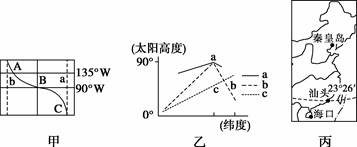③图乙中三条线表示从秦皇岛到海口各地当日正午太阳高度的变化,当太阳直射C点时,正确的是________。