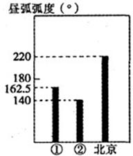 小题2:根据南北半球的对称性可知,与北京纬度相同的南半球的地点昼弧为140°,结合南半球昼夜长短随纬度的变化规律知②纬度高于①,那么三者比较可得出①<②=北京的结论。