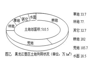 (2)读图乙,说明黑龙江垦区土地利用构成的显著特点。(6分)