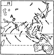(3)图示的时间为     月,北半球的   季,A处的气压名称为            。如果季节相反,则B处吹             风;C处吹              风。