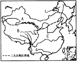 小题2:B区域为青藏高寒区,属于西部经济地带,经济发展水平和速度都低于中部地区,该区域交通运输以公路为主;人类对自然界的影响微弱,原始自然状态保存得比较完整;青藏高原地区气温日较差大,年较差小。所以本题选择C选项。