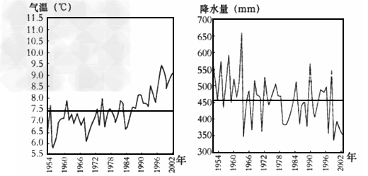 5、单选题 读“我国华北地区1954-2002年气温与年降水量变化示意图”,做1-3题。