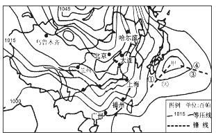 1、单选题 下图示意北半球某区域2012年1月4日14时和5日8时海平面气压(单位:百帕)分布图。读图完成下列问题。