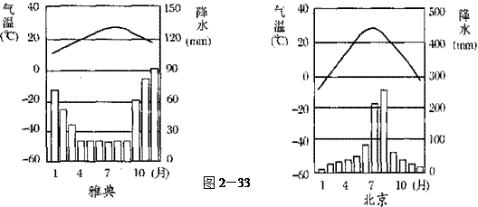 3、单选题 2004年和2008年夏季奥运会分别在雅典和北京举行,下图是两地的气候资料。读图回答。