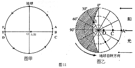 (2)图乙中A点在昼半球的中间,因此是12点,因此A点所在的经线地方时是12点;根据地球自转方向,可知B点在昏线上,因此太阳高度是0°。