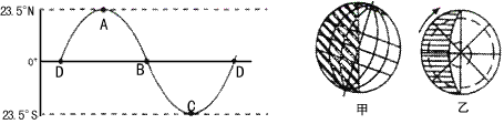 5、综合题 读“太阳直射点移动示意图”及“光照示意图”(图甲、图乙),完成下列要求。