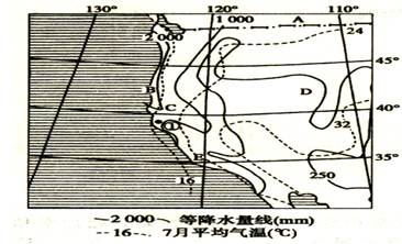 (1)图中C地7月平均气温低于_________?C。B地降水量超过________毫米,造成该地多雨的原因是_______________________________________。