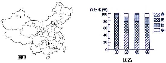 5、单选题 图甲中a、b、c、d是我国四个城市,图乙是图甲四个城市的春夏秋冬四个季节降水量占全年降水总量的百分比图,据此回答下列各题