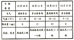 (3)读图,该时段是10月份,北方冷空气活动增强,根据表格数据,该时段风向由西南风转偏北风,风力加大。出现强降雨天气,且天气系统过境后与过境前相比,气温明显下降。说明影响A城市的天气系统冷锋。